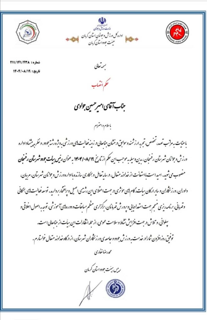 با توجه به تعهد، تخصص، تجربه ارزشمند وسابقه درخشان جنابعالی در فعالیت های ورزشی به ویژه جودو و با نظر به پیشنهاد اداره ورزش و جوانان شهرستان رفسنجان، بدین وسیله از تاریخ ۱۳۰۲/۰۸/۱۹ جناب آقای امیرحسین جوادی به سمت رئیس هیئت جودو شهرستان رفسنجان منصوب میشوید.