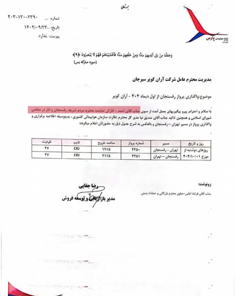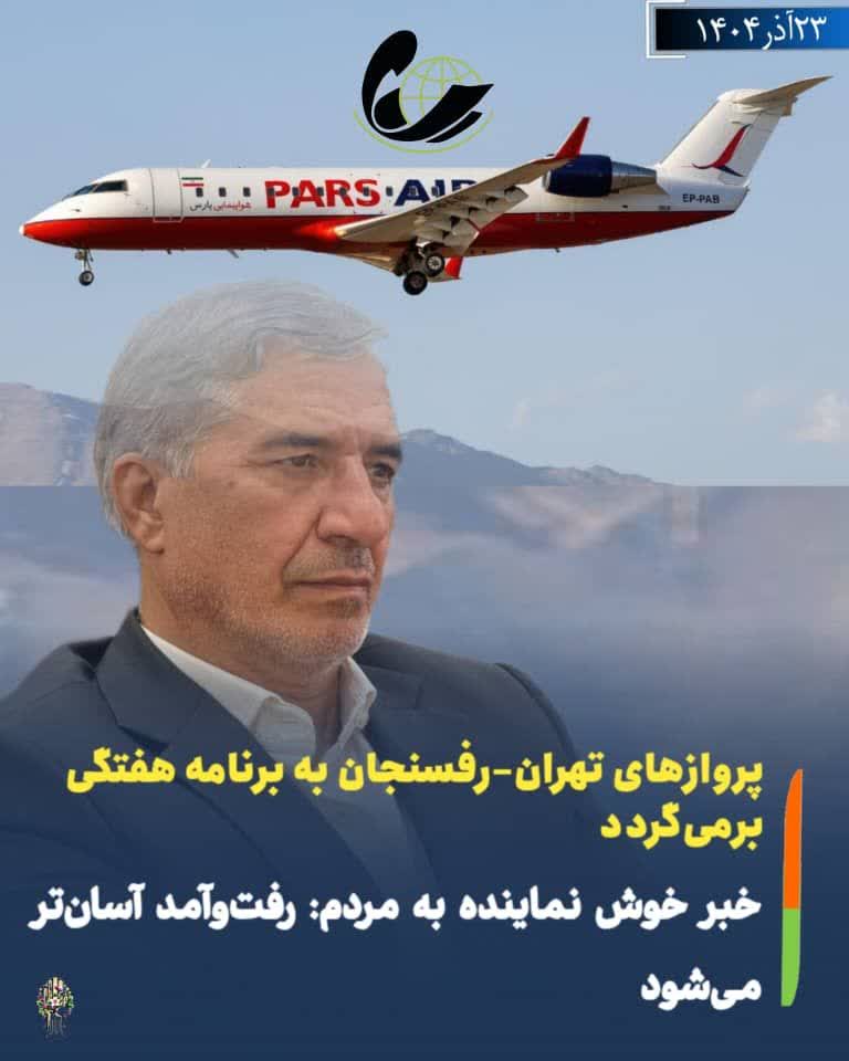 احمد انارکیمحمدی؛ نماینده رفسنجان و انار، از بازگشت پروازهای مسیر تهران–رفسنجان و بالعکس خبر داد و اعلام کرد: